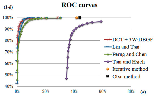 The frequency domain methods were used mainly in this study, so the spatial domain methods and other related methods are discussed to evaluate the detection performance of touch panel defect detection. Common spatial domain methods are Iterative [21] and Otsu [5], which directly use the calculated binarization threshold to process the original spatial image. The frequency domain methods can be compared with those of Tsai and Heish [17], who proposed a band filtering (BF) method using Fourier transform with Hough transform; Perng and Chen [18], who proposed a threshold filtering (TF) method using DCT with Rosin unimodal threshold; and Lin and Tsai [9], who proposed a multicrisscross band filtering (MC-BF) method using Fourier transform. All were applied to the testing objects with the directional background patterns and were applied for defect detection. In this study, 148 testing images were used to detect surface defects in the touch panels in the spatial and frequency domains, and the evaluations of the detection effect and efficiency were compared. We drew the corresponding ROC curves according to the k values of different parameters and selected the inspection standards of this study. Figure 15 shows the ROC curves of the frequency domain methods and the related research methods. The results reveal that although the spatial domain methods have higher defect detection rates, the false-positive rates of the normal areas are relatively high. Therefore, the spatial domain methods are less suitable for detecting defects in the testing samples for this study. The ROC curves of the methods proposed by Tsai and Hsieh [17], Perng and Chen [18], and Lin and Tsai [9] are lower than the ROC curves of our proposed method, with α being significantly higher than the detection results of this study and (1 − β) being lower. Therefore, the proposed method has better detection outcomes, as shown in Table 3. The proposed DCT-based 3W-DBGF method has 94.21% for (1 − β), 1.97% for α, and 98.04% for CR. The detection time of the DCT based filtering method takes 1.62 s, which is relatively time-consuming compared to other methods, mainly because the main bands and sub-bands in seven band ranges are considered.