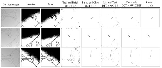 Figure 16 shows images of the results of this study using spatial domain and frequency domain methods with comparison to images tested by other professionals. The results show that the spatial domain method is less effective for the inspection of surface defects of the touch panel and cannot correctly distinguish a flaw from a background. the Tsai and Hsieh’s [17] method detects the angle of the high-energy band and removes the frequency values within its band to highlight flaws; however, the precision of the angle selected with the Hough transform is very important, and other angles can cause errors in filtering the band range, so the probability of the background of some images being misjudged as defects is quite high. Although Perng and Chen [18] used DCT with the Rosin single-peak threshold method, mainly to remove high-energy components, the results show that the location of the defect can be clearly judged, but the false-positive rate of the normal area is slightly higher. After various defect detection methods were performed, the results were statistically evaluated and analyzed, showing that the detection indicators of the proposed method are better than those of other methods.