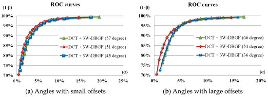 ROC curves of the detection benefit using the DCT-based 3W-DBGF method for (a) small offsets (±6°) and (b) large offsets (±15°) in band angles.