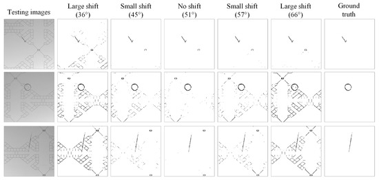 In the DCT energy spectrum image, the high-energy values are relatively concentrated in the band locations of three angles (0°–51°–90°). These three areas need accurate filtering for defect detection. We investigated whether the change of the oblique angle has an impact on the detection efficiency. The oblique angle was changed from 51 degrees to a small offset of 6 degrees and a large offset of 15 degrees, while the bandwidth angles in the horizontal and vertical directions remained unchanged at 0 degrees and 90 degrees. Figure 17 shows the ROC curves of detection benefit using the DCT-based 3W-DBGF method for small offsets (±6°) and large offsets (±15°) in band angles. The DCT-based approach showed no significant difference in the detection results when the band angles had small offsets; however, when the band angles had large offsets, this had a significant impact on the detection results, but the detection results of accurate filtering were still better. Figure 18 shows the partial detection results of using the DCT-based 3W-DBGF method for various levels of offsets in band angles.