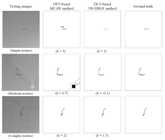 Figure 6 shows the performance of three-way band filtering on the discrete cosine energy spectrum images for the normal and the defect images. The bandwidth of these frequency domains are 3, 8, and 16 pixels, respectively. The energy spectrum images converted in the frequency domains are in the fixed direction and within the ranges of the bandwidths, so the frequency values in these intervals are deleted in different bandwidth ranges, with the amount of energy deleted being different. If the bandwidth is wider, more energy spectrum values will be deleted. Although the background texture of the rebuilt image has been roughly eliminated, the defects are for the most part removed. Therefore, choosing different bandwidths in different frequency domains has different effects on detection efficiency.