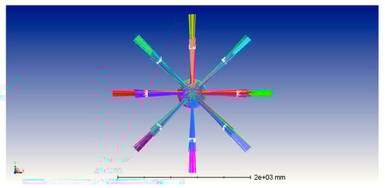 As shown in Figure 3, we place 16 LEDs on the transmitter. LEDs are evenly distributed on the hemisphere according to the latitude and longitude direction, and the distance of the communication link is set to 10 m. Assuming that the transmitter and receiver are aligned, each detector forms a corresponding light spot on the receiving surface. As shown in Figure 3, the light spot was transmitted by an LED on its corresponding detector. We obtain the channel gains for users with different locations. Next, we discuss the selection of beams and power allocation for single-beam and multiple-beam NOMA systems.