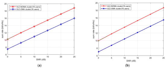 In particular, the conventional OMA system uses a time division multiple access (TDMA) scheme to serve numerous users. To maximize the minimum rate, the user is served with full power in each time slot. Figure 4a,b show the sum rates of UVLC-NOMA and UVLC-OMA at a different signal-to-noise ratio (SNR) under the same QoS and different QoS, respectively. Additionally, they show that NOMA improves the throughput by at least 30% compared to OMA. Moreover, with the improvement of SNR, the sum rate of NOMA is always higher than that of OMA.