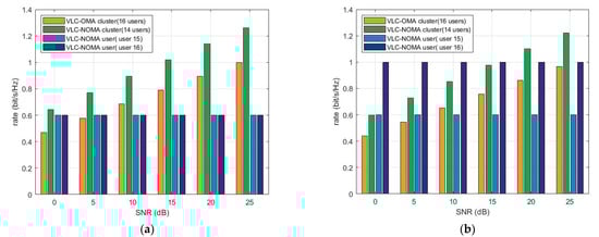 Figure 5a,b shows the rate of each user, where the histogram of the UVLC-NOMA cluster contains 14 s-class users for fairness. Under the same SNR after power allocation, the rates of all users in UVLC-NOMA are equal. The fair power optimization is performed on these 14 users, so all users in the second type of users have the same rate. The histograms of users 15 and 16 represent the rate of a single user, which is the minimum rate set by the algorithm under the QoS guarantee. When users 15 and 16 are under different QoS, the rate of user 16 is greater than the rate of user 15. It means the power allocation algorithm can optimize the power to make the edge user get the optimized QoS.