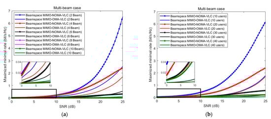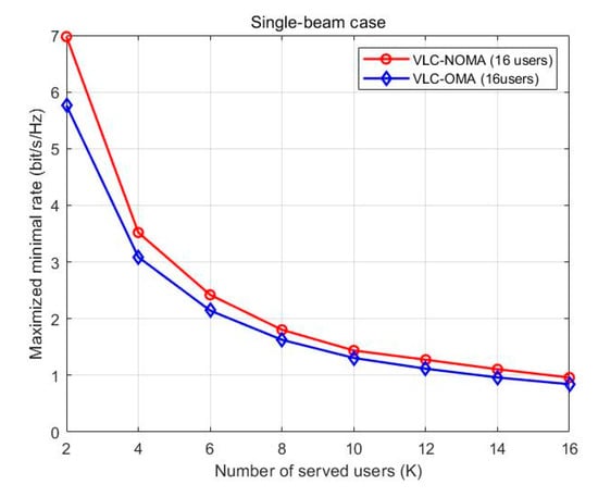Figure 6 shows that the maximized minimal rates vary with the number of users when there is no QoS constraint. In a single beam, a power allocation of max–min fairness is carried out to all users of UVLC-NOMA and UVLC-OMA systems. Figure 6 also shows that the maximized minimal rates of NOMA technology are greater than that of OMA technology in the UVLC access system over the entire SNR region. As shown in Figure 6, as the number of users increases, the maximized minimal rates of users drop sharply, but the maximized minimal rates of NOMA technology go down more slowly than the OMA technology in the UVLC access system as the number of users increases.