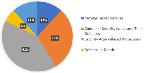 - Moving target defense: MTD is a strategy that modifies specific system components to make it more difficult for attackers to carry out successful attacks, lowering the attack capabilities. The primary objective is to stop attackers from using information they have learned about target systems due to their homogeneous composition and software monoculture. There were 11.8% primary studies that focused on MTD. Torkura et al. [35] identified the shared vulnerabilities in the microservice architecture and proposed a solution utilizing the moving target defense (MTD), which evaluates the system’s risk assessment. The risk assessment is crucial for the system to identify the potential vulnerabilities, likelihood, and impact. The authors also derived a risk-oriented diversification index and utilized it to alter the attack surface and reduce the attack ability. The potential emergence of security concerns may be unpredictable due to the cloud environment’s modification. To defend the system against attacks, Jin et al. [32] thoroughly analyzed the fixed defensive strategies of MTD. They also provided a framework called DSEOM that could recognize updates to the container-based cloud environment, quickly assess the effectiveness change of MTD, and optimize MTD strategies.