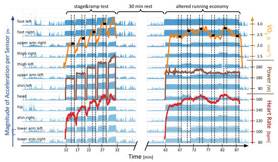 Overview of all collected data for a single athlete: the magnitude of accelerometers at 12 positions on the body (blue); red: heart rate; brown: running power (Stryd); orange: ; dashed lines = time section used for tests; in the left half is the last 60 s of each stage in the graded exercise test; on the right are the last 60 s of each modified running condition; black boxes mark the average for each section. Best viewed in color.