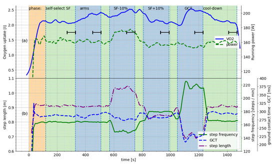 Exemplar protocol for the second part of the experiment and varying spatiotemporal parameters for a single subject. (a) Oxygen consumption and running power as measured using a single foot-worn commercial sensor during the running conditions. (b) Spatiotemporal running parameters of the subject in reaction to instructions for the experimental conditions. Reprinted with permission from Baumgartner et al. [11]. Best viewed in color.