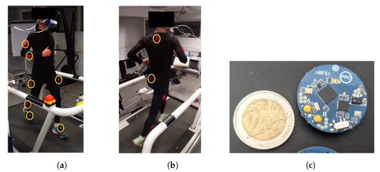 (a,b) Picture of sensor suit from front/back. Sensor Beacons are attached to the runner in pink sewn-on pockets (yellow circles) at 12 locations: 2 × feet, 2 × shin, 2 × thigh, 2 × upper arm, 2 × lower arm, hip, and neck. (c) Picture of the used Bluetooth beacon (weight = 6 g, diameter = 3 cm, coin for scale).