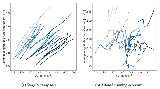 Correlation between and the average magnitude of acceleration during (a) the initial stage-ramp test and during (b) the running experiment with altered running economy. Each line signifies a single athlete. The shade of blue of the line signifies the body weight of the athlete (darker = heavier). Dots signify the different stages in (a) or altered running conditions in (b).