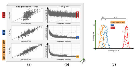We repeated the training for 40 repetitions with different initial values for and data shuffling. In Figure 5c, we show the final training losses for all training runs in a single plot, with the loss on the x-axis and the repeated training runs stacked on the y-axis. It can be seen that there were clear differences between the ability of the same architecture to minimize the loss when given noise as input (red), just accelerations from one foot (blue), or the combination of accelerations from the foot + torso + lower arm (three sensors, orange). There were big significant differences between just the foot and three sensors: p(foot + torso + arm, foot) = . There were also significant differences between foot and noise: p(foot, noise) = . This proves that there is indeed mutual information about the oxygen consumption contained in measured acceleration data .