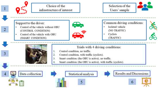 In this regard, if a specific road section must be investigated, it would be advisable to build a larger sample of users, identifying the most fragile class of users on that road (it could be represented by the elderly, for example). This characteristic should be ascertained through a specific accident analysis. Regarding the device to be tested, its modifications could be considered if the results are not satisfactory. If the critical issues do not concern the device but the infrastructure, then the road manager will have to make the necessary corrections to the road context or insert road traffic restrictions [28].