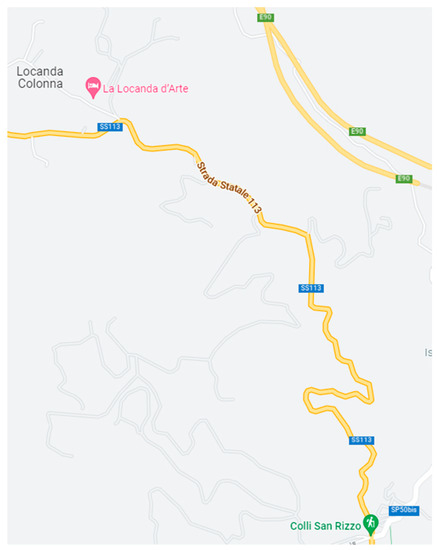 The simulated environment was based on an existing rural road, located within the municipality of Messina, Italy, known as SS113. This road connects the localities of “Colli San Rizzo” and “Locanda” (Figure 2) and is characterized by a winding alignment, not fully in compliance with modern road standards. Specifically, the curves are composed only of circular arcs without transition elements and have inconsistent radii. The road cross section, which consists of two lanes and two small shoulders, with a total width of about 7 m. visibility, in isolated vehicle conditions, is hindered by irregular horizontal and vertical geometry. Road signs and markings constitute an important source of information in a critical context, which can be further exacerbated by adverse weather conditions or traffic.