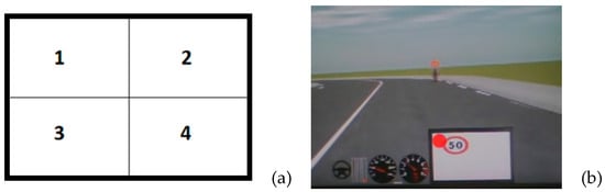 As shown in Figure 3a, it is possible to identify four quadrants in which feedback related to inappropriate and/or dangerous driving behavior is displayed in dials 1, 2, and 3. In quadrant 4, on the other hand, informative feedback on some critical aspects of the road layout is displayed. The indications displayed on the OBU were deemed to be adequate and clear for the users, even though the images displayed on the figure showing the simulator screen may not perfectly represent the actual visibility conditions. At the end of the experimentation, users were asked to fill out an additional questionnaire to identify any operational and perception difficulties encountered during the experimentation. No issues were reported regarding the comprehensibility of the information provided by the OBU.