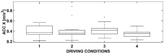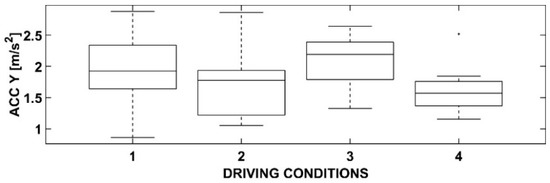 Although the box plot in Figure 6 seems to show some differences in the averages of the first three conditions, their magnitude is too small to allow for any meaningful conclusions. The lines extending beyond the box represent the expected deviations as determined by the ANOVA analysis. It can be observed that the greatest dispersion of Acc Y occurs in the first driving condition, where the user is in control condition and there are no cyclists. This result suggests that the absence of external constraints, such as cyclists or violation-signaling devices, allows the user to exercise greater freedom in their driving behavior, which may vary according to their individual driving skills. However, it is worth noting that the sample size may not be sufficient to fully capture these variations. A larger sample size may have led to a more accurate representation of the data.