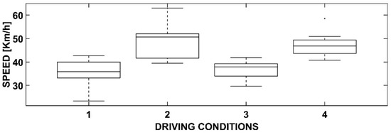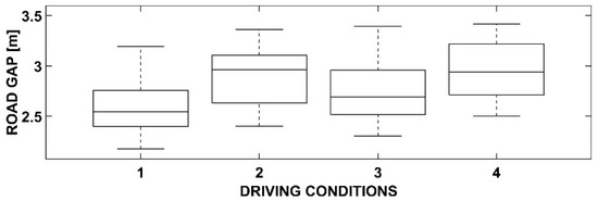 This measure indicates the distance of the center of the vehicle from the right edge of the road section. In the present case, the overall section is 7.00 m wide, 3.50 m of which is dedicated to a lane, plus a small shoulder for each side. It means that the vehicle is perfectly in the middle of its lane when the road gap is equal to 1.75 m. In this condition, as the vehicle is about 1.60 m wide, the distance between its left edge and the central axis of the road is 3.50 − (1.75 + 0.80) = 0.95 m. Figure 7 shows that the road gap variable took values of around 3.00 m in driving condition 4, and then the vehicle crossed the center line (separating the two opposite directions of traffic) for about (3.00 + 0.80) − 3.50 = 0.30 m. This result, on such a winding road and considering the presence of cyclists (and, therefore, a further deviation from the right edge during the passing), can be considered widely acceptable.