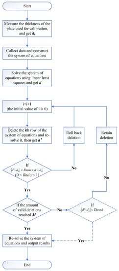 When the number of deletions reaches a certain threshold M or the difference between the solved d and its measured value is less than a certain threshold , the above operation is terminated and all unknown variables are solved with the remaining equations. Although we cannot know the error of (, , , ) from the solution result, the difference between d and its measurement can be used for the evaluation of the accuracy of the entire solution. The whole procedure is shown in Figure 2.