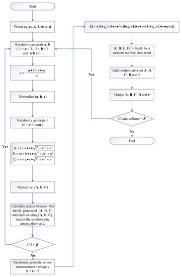In our simulation, we preset the sensor’s laser beam vector and origin coordinates, as well as the thickness of the plate. To avoid the influence of special values, a random change was attached to the preset values during each individual simulation. To generate the parameters of each plate’s pose and position, a set of , , and was randomly generated, and, then, the measurement of voltage was obtained. was calculated by using , , , and with preset values. Thus far, we could obtain the ideal parameters of the LDS and plate under the current plate pose and position. Then, we applied random errors to the planar parameters and voltages, where the voltage error was set according to the physical parameter of the LDS, which was 0.1%, and the planar parameter error was the variable factor we were concerned with. The error level was constant in the same simulation. The generation of random , , and was repeated until the number of equations reached a specific value K, which was another concerning factor. During the generation process, , , and underwent screening, which was based on the maximum and minimum angles mentioned earlier. Among them, the maximum angle limited the angle between the normal vector of the plane (i.e., (, , and )) and the preset sensor measurement vector (i.e., the laser beam vector in the real LDS), and the minimum angle limited the minimum angle value of angles between the normal vector of the newly generated plane and that of all planes that already existed. Only the , , and that passed the maximum and minimum angle screening could be used in the subsequent procedure. The whole procedure is shown in Figure 4. The intermediate variables a, and r were used to generate the plane parameters.