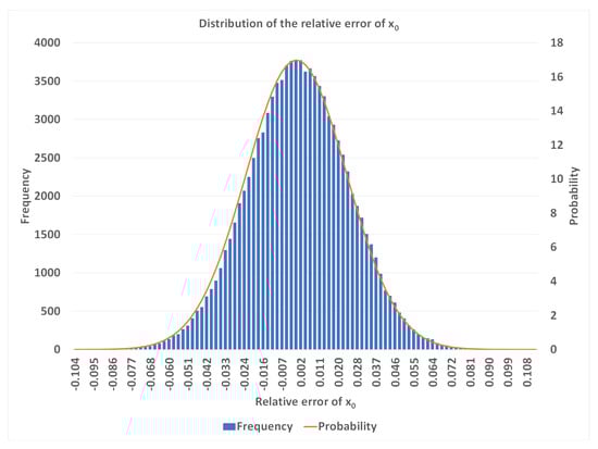 Once enough data were obtained, they were substituted into the calibration program, the solved variables of , , , l, m, n, and d compared with the preset ones, and the ratio of the error and the preset value (i.e. the relative error) recorded. With the same set of , , , and K, this process was repeated 100,000 times, resulting in a normal distribution of errors. An example of is shown in Figure 5.