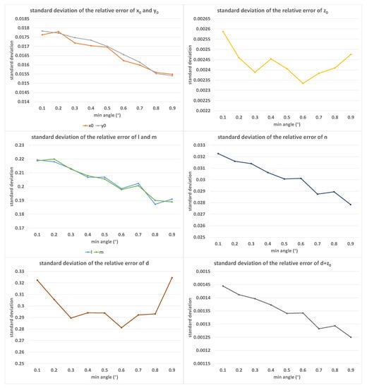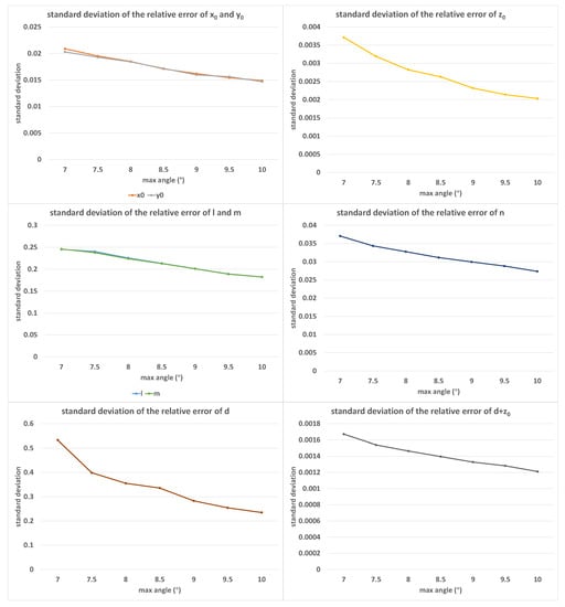 The standard deviations of relative errors of (, , , l, m, n, d, ) with the increase in ; the horizontal axis was measured in degrees.