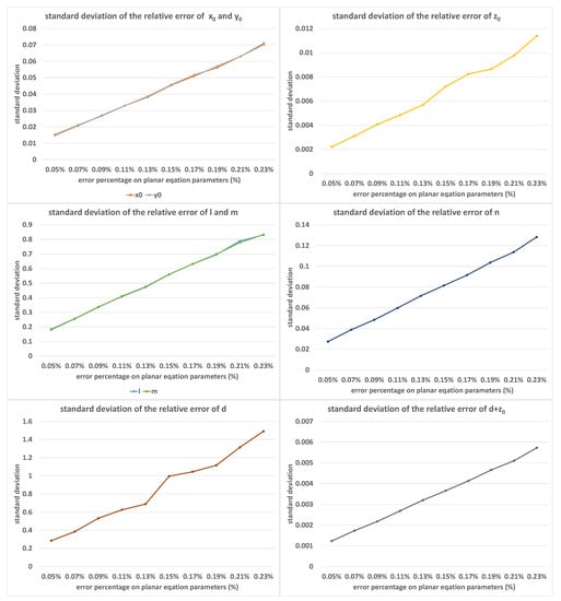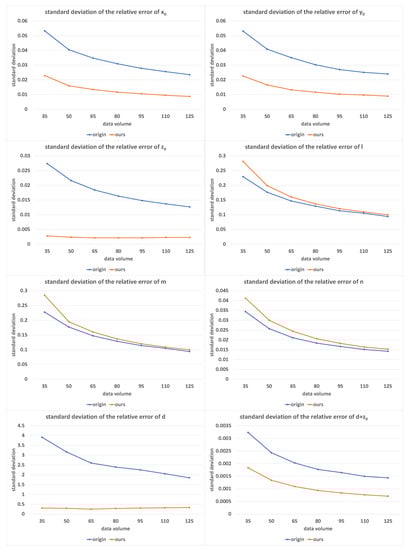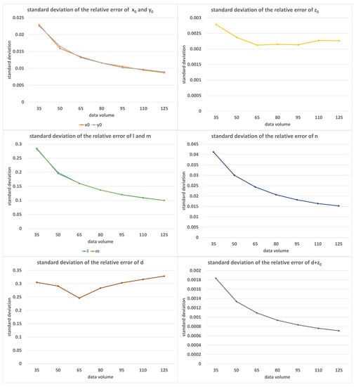 The standard deviations of relative errors of (, , , l, m, n, d, ) with the increase in ; the horizontal axis was measured as percentages.
