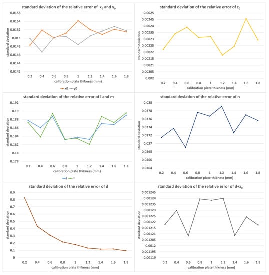 The standard deviations of relative errors of (, , , l, m, n, d, ) with the increase in d; the horizontal axis is measured in millimeters.