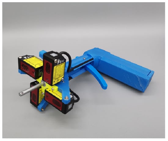 The object of the actual calibration experiment was a hand-held instrument aimed at measuring the verticality of the hole, as shown in Figure 12. At the end of the instrument were four LDSs distributed equidistantly around the circumference, and on the axis of the circumference was a rod with three protruding claws to accommodate holes of different diameters. When measuring, the rod probed into the hole and the three claws extended out; thus, the rod and the hole were coaxial. At this time, the four LDSs measured the distances from themselves to the surface around the hole and calculated the 3D coordinates of the four measured points, according to the origin coordinates and laser beam direction vector obtained by calibration. Then, the surface normal was obtained by plane fitting, and its angle with the axial direction of the rod was calculated. The axial direction of the rod was measured prior and recorded with the instrument software. The four LDSs were the Panasonic HG-C1030 model, where the measurement center was 30 mm away from each sensor’s origin. The measurement range of the sensors was 30 ± 5 mm, and the distance value from −5 mm to 5 mm was represented by a 0–5 V analog voltage with a nonlinearity of ±0.1% in the whole range. The circuit board in the handle read, digitized, and output the voltage values of the four sensors. The goal of calibration was to obtain the origin coordinates and laser beam direction vectors of the four LDSs. As can be seen, this instrument worked independently and was not attached to a coordinate system. Therefore, its calibration had to be exogenous. This was why we developed the proposed calibration method.
