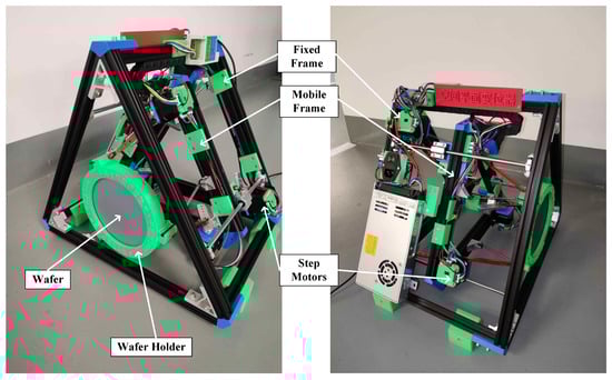 In order to achieve better reproducibility of the attitude transformation, the wafer was installed on an electric motor-driven platform, which had six motors and controlled the attitude and position of the wafer within a certain angle range, as shown in Figure 13. The platform consisted of a fixed frame and a mobile frame. The three motors mounted on the fixed frame drove the mobile frame linearly along three rails to achieve the change in the planar equation parameter D. The three motors mounted on the mobile frame drove the wafer holder to change the pose to achieve the change in the planar equation parameters A, B, and C. Thus, the wafer could be directed to any pose and position within the range of the connecting rods. Motor rotation angles under each pose and position could be recorded and replayed. At the same time, they could also be randomly generated by the controlling software. The motor-driven platform was specially designed and developed for calibration by the authors. The step motors were manufactured by Makerbase and the frame consisted of aluminum profiles and 3D-printed parts. The controlling software, which had the ability of moving control, pose prediction, and data calculation, was developed under UOS (Uniontech Operating System). The platform ensured the experiments were reproducible and improved the efficiency of random plane generation, compared to manual operation. To avoid the force deformation of the wafer, the wafer holder flexibly clamped the wafer via two rubber rings and maintained a very low clamping force that only kept the wafer relatively stationary while moving. The effectiveness of this clamping method in avoiding deformation was verified by the RANSAC (random sample consensus) plane fitting of the measured point cloud of the wafer when it was fixed.