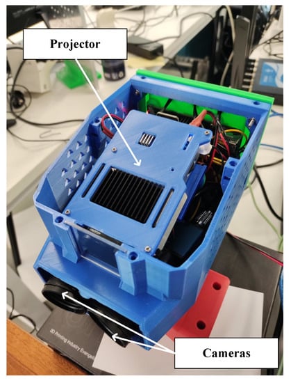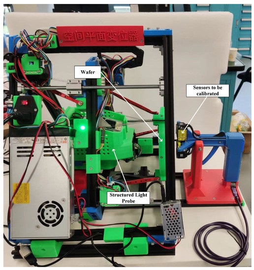 Specifically designed for calibration, the front and rear of the silicon wafer on this platform were fully open to be observed by the SLP and the LDSs at the same time. As the source of precise plane parameters, the SLP adopted the principle of a three-frequency, four-step phase shift, had two cameras with 5 million pixels, and was calibrated by a checkerboard with a pattern accuracy of ±1 m. The SLP had a scanning volume of around 40 mm ∗ 30 mm ∗ 20 mm and achieved a measurement accuracy of 0.02 mm under the VDI/VDE 2634 standard [18]. The planar equation parameter uncertainty was less than 0.02% for multiple scans and fittings of the same surface when the wafer was fixed. The SLP is shown in Figure 14.