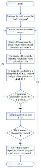 In this paper, a novel method for the pose and position calibration of laser displacement sensors is proposed, with the aim of solving the three problems. This method realizes the calibration of the laser beam direction vector and sensor origin coordinates based on a double-side-grinded monocrystalline silicon wafer, and evaluates the calibration results with high accuracy. The basic idea is that a double-side-grinded monocrystalline silicon wafer is placed between the LDSs and a structured light probe (SLP). When the pose of the wafer is changed, the SLP measures its pose and position by scanning the wafer, and then a group of linear equations is constructed. Each time the wafer is moved, a group of equations is established, and, once there are enough equations, they can be solved by using the least squares method. For systems of super-determined linear equations with errors, the least squares method is a major method of flattening the error, and a sufficient number of equations can suppress the error to an ideal degree [16]. The exact number of equations for which the desired result is obtained are later indicated in subsequent simulations. The thickness of the wafer is measured and used to remove unsuitable equations. The remaining equations are used to solve the calibration parameters. The main merits include the following:
