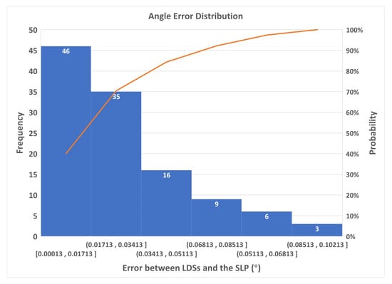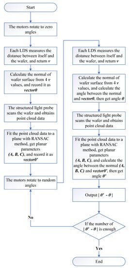 As a verification of the calibration results, the calibrated LDSs and the SLP were used to measure the wafer’s surface normal vector as a basis for the initial posture (when all motor rotation angles were ), and then, they were used to measure the wafer under each of the 115 different poses, simultaneously. The angle between the normal vector of each pose and the basis was output separately, the result from the SLP was used as a reference, and the result from the LDSs was used as the measurement value. A simplified diagram of the validation procedure is shown in Figure 17.