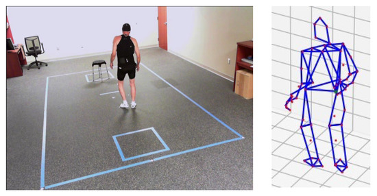 Motion capture recording during timed-up-and-go testing. Left: clinical motion capture laboratory. Right: example of kinematic marker data. Participants were instructed to rise from the stool, walk to the taped box, and return three times during each test.