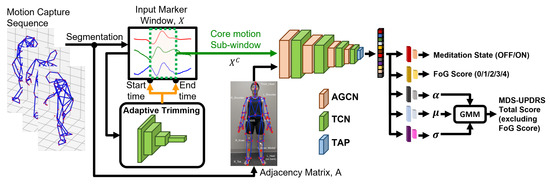 Overall model architecture. The recorded motion capture sequence is segmented into 4 s analysis windows, which are first processed with the Adaptive Trimming (AT) model. AT model, which uses a 4-layer temporal convolutional network (TCN), predicts the start and end index of the core motion segment that is most relevant for the prediction task. The core motion segment is processed with a 4-layer adaptive temporal-spatial graphical convolutional network (AGCN), which automatically learns the attention map for the most relevant joint and limb motion for the prediction task. The feature representation from the final layer of AGCN is processed with temporal average pooling (TAP) to summarize temporal information, which is then used to predict medication state, FOG score, and MDS-UPDRS-III total score (excluding FOG score) at the same time. Specifically for regressing the MDS-UPDRS-III total score (excluding FOG score), Gaussian Mixture Model (GMM)-based regressor is used to take account of the non-Gaussian distribution of the target values.