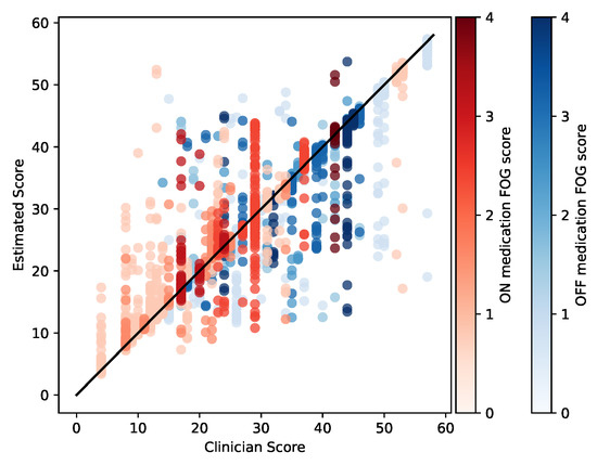 Scatter plot comparing clinician-rated versus model-estimated MDS-UPDRS-III total score, excluding the FOG item (3.11). Unity line is shown for reference. Each dot represents a single 4 s analysis window. Colors are used to represent the FOG item scores corresponding to each analysis window, with darker colors indicating more severe FOG in the OFF (blue) and ON (red) medication states.