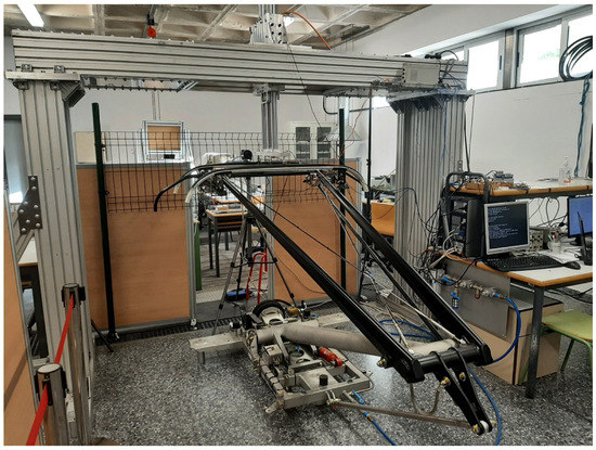 In the case of closed-loop test benches, the first proposals [20,21] used a truncated modal approach to simulate the virtual catenary and two servo-hydraulic actuators to interact with the real pantograph. The lower actuator was used to generate the locomotive motion on the bottom of the pantograph. According to the virtual catenary simulation, the upper actuator moves the pantograph collector head. The response time of the actuators was 20 ms (up to 50 Hz). Another HIL simulator and its improvements are presented in [22,23]. This test bench generates the movement of the CPI on the contact strips of the pantograph using an electrohydraulic actuator. This actuator guarantees a bandwidth of 25 Hz. The simulation of the catenary runs on a real-time platform and includes non-linear dropper behavior. More recently, [24] presented a more advanced catenary model with 3D Euler-Bernoulli beams. The catenary gives the position and velocity references to a robot arm, generating the CPI movement on the pantograph. This system includes a controller to guarantee HIL simulation stability at the cost of generating fake force to counteract the effect of high frequencies in the variables. Because the robot consists of electric actuators, this system can work faster than the others reaching frequencies up to kHz.