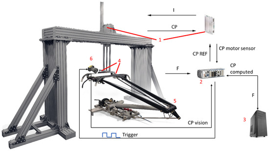 Scheme of the test bench components. 1. Linear motor and motor drive; 2. Real-time controller; 3. Virtual catenary; 4. Sensors; 5. Pantograph; 6. Linear camera.