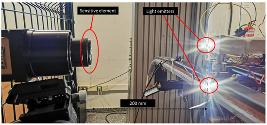 The direct lights installed on the pantograph and in the motor are framed to project the light on the sensitive element’s column, as shown in Figure 3. A frame grabber allows Camera Link communication and ensures the system is deterministic regardless of the operating system used to guarantee the necessary frame rate. Moreover, a 50 mm F2.8 lens has been installed to illuminate the sensor correctly. With this lens, the camera can be placed at 200 mm of the setup, as shown in Figure 3, so it generates a minimum distortion in the image.