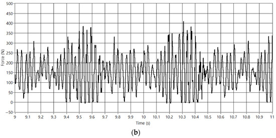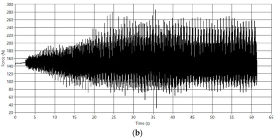 Section 3.1. showed that pantograph model identification is an interesting topic to be researched. The problem can be approached from different perspectives [46]. The test bench can generate any contact signal to study the response of the pantograph and fit a model, for example, chirp signals, including wide frequency content. Figure 15a shows a chirp signal, and Figure 15b the force response.