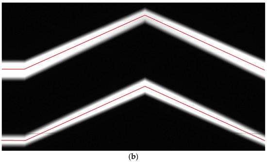 The camera is calibrated to obtain measurements in the image in millimeters. For this purpose, the system generates a 600 mm ramp to move the pantograph and to study this movement in the acquired images. The aim is to establish the ratio between pixels and millimeters in each frame. Figure 12a shows the generated pattern, and Figure 12b the acquired image. Each column represents one step of the calibration process, and the two white areas represent the position of the pantograph and the wire in the image. As mentioned before, each blob’s centroid defines the pantograph and the wire positions in the image. The red line in Figure 12b shows computed values in the image. Since we are measuring the distance between the pantograph and the wire, the calibration process computes the ratio pixel/mm. Moreover, the variation of this ratio over the length of the pixels line is also studied. Some optics distort the image, and this effect should be considered to obtain accurate measurements. In this case, the ratio has proved to be constant.