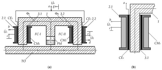 The E-core forms with the TO two interconnected ferrimagnetic circuits (FC) I and II, through which the magnetic fluxes ΦI and ΦII are configured in a certain way, initiated by combined physical fields: the PM constant magnetic field and variable magnetic fields formed by excitation currents of electric windings MC1 and MC2.