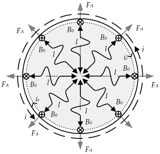 The interaction of eddy currents with the bias field induction B0, causing the occurrence of FA (Ampere force), is defined by acoustic oscillations taking place in the electrodynamic mechanism [,]: