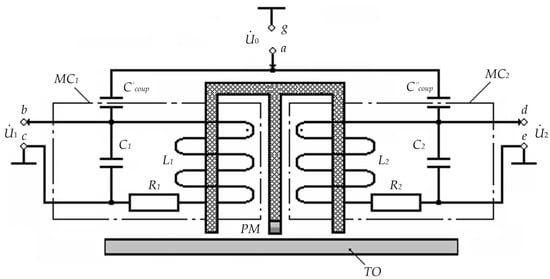 where φ0 = 0; R = R1 = R2, and R1 and R2 are active resistances of the coil windings (MC1 and MC2), respectively; U0m is the high-frequency generator electrical voltage amplitude.