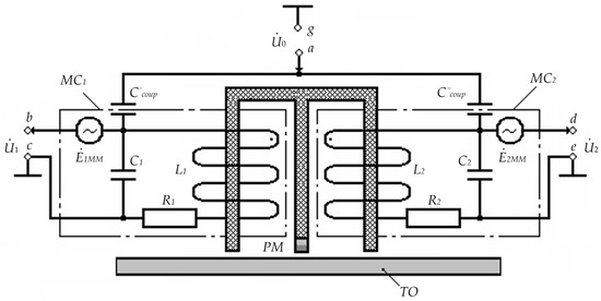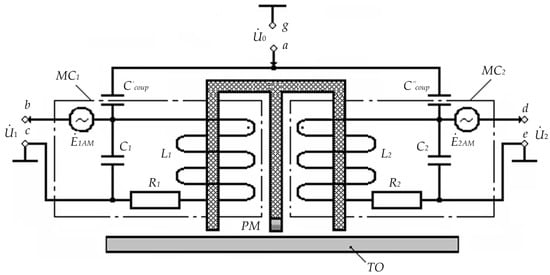 When a high-frequency generator supplies an electric potential φe relative to the case’s electric potential φ0 (grounding point) to CE1 and CE2, respective electric potentials φ′e and φ″e are induced in the lower wire layers of windings of MC1 and MC2. Moreover, the symmetrical spatial arrangement of passage coils and their identical design parameters allow the assumption that φ′e = φ″e = φe. In this case, the required symmetry in the spatial arrangement of passage coils and the balanced lower level of the zero signal are ensured by the corresponding axial shift of passage coil sections relative to the constant magnet. Then, in the series electrical resonance mode (at the cyclic frequency ωr), currents in electric windings of MC1 and MC2 are determined by the equation: