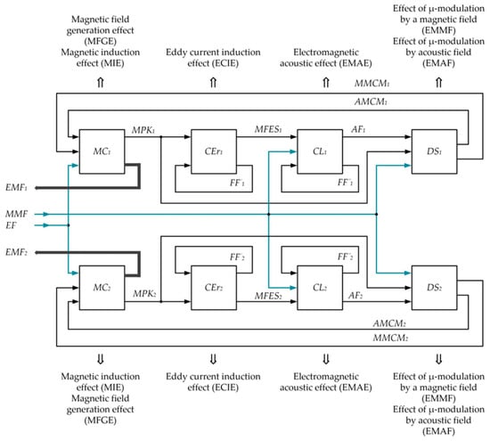 In Figure 7: MC1 and MC2 are measuring coils of, respectively, FC-I and FC-II; CEr1 and CEr2 are conduction electrons of the ferromagnetic material of, respectively, the core elements FC-I and FC-II; CL1 and CL2 are crystal lattices of the material of, respectively, the core elements FC-I and FC-II; DS1 and DS2 are domain systems of the material of, respectively, the core elements FC-I and FC-II; EMF1 and EMF2 are electromotive forces of induction of, respectively, MC1 and MC2; MMF is the magnet’s magnetic field; EF is the alternating electric field induced between CE1 and CE2 and the lower wire layer of windings of, respectively, MC1 and MC2; MPK1 and MPK2 are magnetic fields induced by MC1 and MC2 excitation currents in the material of, respectively, the core elements FC-I and FC-II; FF′1, FF″1 and FF′2, FF″2 are force fields of different levels, manifested as physical effects in the crystal lattices of the material of the MP elements, respectively, FC-I and FC-II; MFEC1 and MFES2 are magnetic fields induced by eddy currents in the material of, respectively, the core elements FC-I and FC-II; AF1 and AF2 are acoustic fields excited in the crystalline lattices of the material of, respectively, the core elements FC-I and FC-II; MMCM1 and MMCM2 are magnetically modulated PM fields in, respectively, FC-I and FC-II; AMCM1 and AMCM2 are acoustically modulated PM fields in, respectively, FC-I and FC-II. This physical FS diagram provides a complete picture of which given input parameters are converted into given output parameters, i.e., reflects the FS working function, and diagrams of individual physical effects describe the FS physical basis and the functional relationship between its structural elements.