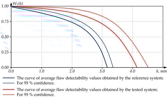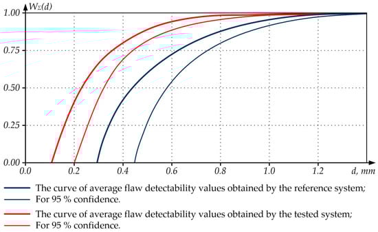 The analysis of Figure 9 shows that the tested NDT system has increased sensitivity (the size of the smallest detectable flaw has noticeably decreased) and a reduced confidence interval compared to the reference one, which indicates an increase in the tested NDT system’s resolution in respect of the flaws.