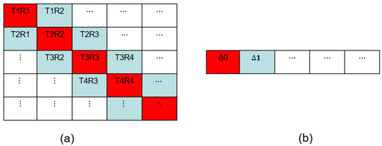 For an ultrasonic transducer with array pitch size, p, and the total number of array elements, M, it is assumed that the transmitting element is T, the receiving element is R, and the number of time points is n. Broadly, the classical full matrix data is a three-dimensional matrix of . In order to realize the measurement of low-angle velocity and minimize the contributions of the abnormal data, the FMC data as shown in Figure 1a is transformed into a three-dimensional matrix of , where the difference between the T and R is defined as ∆ = (). The average of the two signals is taken in case of . The time traces of different transmitting elements and the equivalent ∆ are accumulated, and the average is taken to obtain the two-dimensional matrix of as illustrated in Figure 1b.
