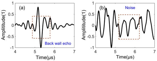 As a consequence of the directional-dependent attenuation effect in heterogeneous CFRP materials, the waveform of the defect signal with the smaller ∆ is clearly distinguished from that of noise, while the defect signals of higher ∆ are often hidden in the background noise, delivering an inability to the recognition and extraction of defect signals (i.e., the time that signals scattered from defects arrive at the receiving element becomes unmeasurable). Therefore, the defect information from time traces of high ∆ is not considered here (see Figure 2).
