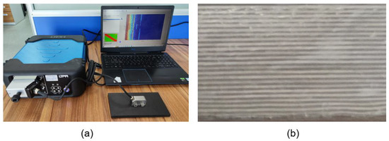 A 10 mm thick CFRP test specimen in which the nominal density was measured by the manufacturer as 1512 kg/m3 was designed and fabricated to contain the artificial defects with specified size. More specifically, the specimen contains 23 unidirectional plies of the same thickness stacked in a repeating sequence of two orientation angles (e.g., 0°and 90°). As shown in Figure 5, the release films were embedded during manufacturing to simulate the delamination defects, which were located at depths of 3 mm and 5 mm and had a diameter of 8 mm. Figure 6 displays the experimental setup of the phased array detection and cross-section of the bespoke CFRP test block.