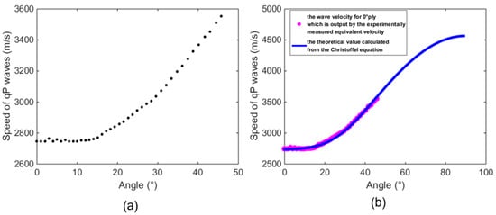 where = − 2, and the calculations of velocity fitting is not affected by unknown () under the assumption of longitudinal wave measurement. The extrapolated results in which the wave velocities of the CFRP laminate at high angles are fitted by the genetic algorithm. It can be seen from Figure 8b that the wave velocities change gradually in the vicinity of 0° and rise sharply with increasing angles.