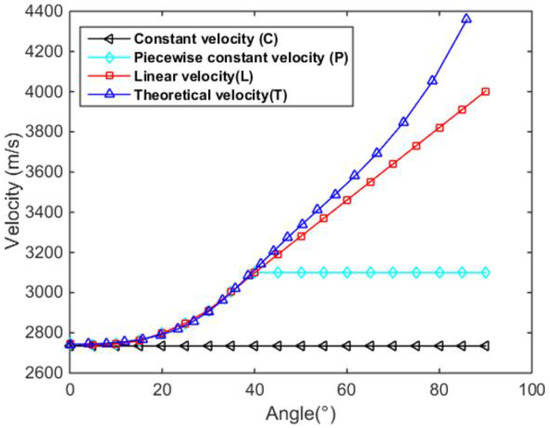 Next, based on above mentioned velocities at low angles, four different types of high-angle velocity prediction methods are proposed for a comparative study. As shown in Figure 9, the constant velocity (C) refers to the wave velocity at vertical incidence (i.e., angle of 0°) applied consistently to each angle, and piecewise constant velocity (P) denotes the constant wave velocity at high angles, equal to the maximum velocity at low angles, such that the curve at different angles exhibits good continuity. Furthermore, linear velocity (L) indicates that the high-angle velocities change linearly according to the first derivative at the critical point. Theoretical velocity (T) is the predicted high-angle velocities calculated from Equation (19). Note that all the non-discrete points of the curves are obtained by linear interpolation. While the low-angle velocities of the last three types of curves are the same, the high-angle velocities of the P curve is significantly different from those of other two curves, and the difference between T curve and L curve is less measurable.